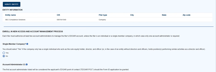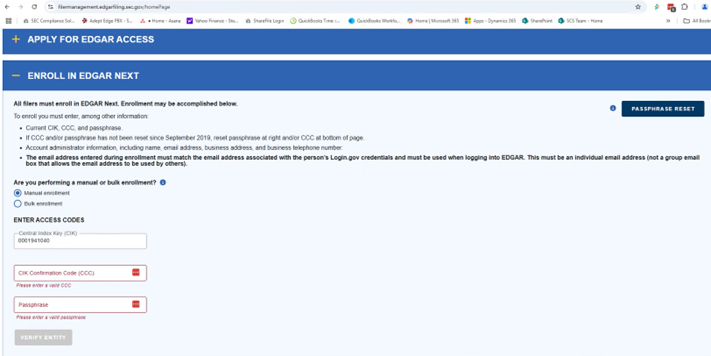 6. After successfully entering your CIK, CCO and Passphrase, click “Verify Entity.”