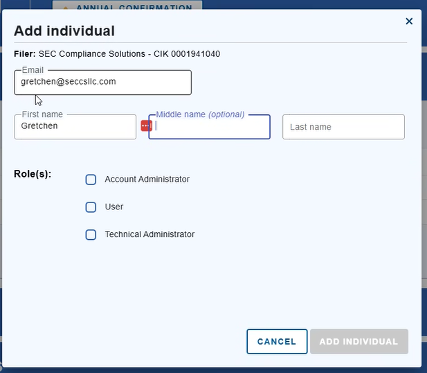 Enter your firm’s CIK number, CIK Confirmation Code (CCC), and Passphrase